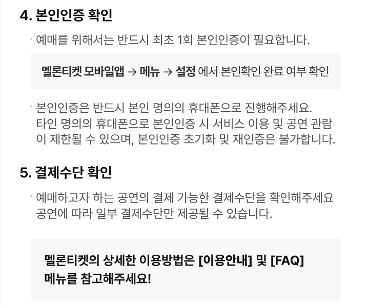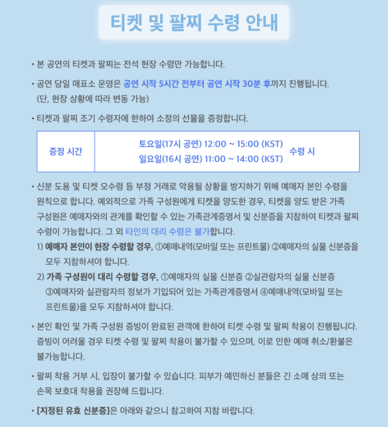 - 대리 티켓팅 금지: 본인 명의가 아닌 계정 예매 시 입장 불가