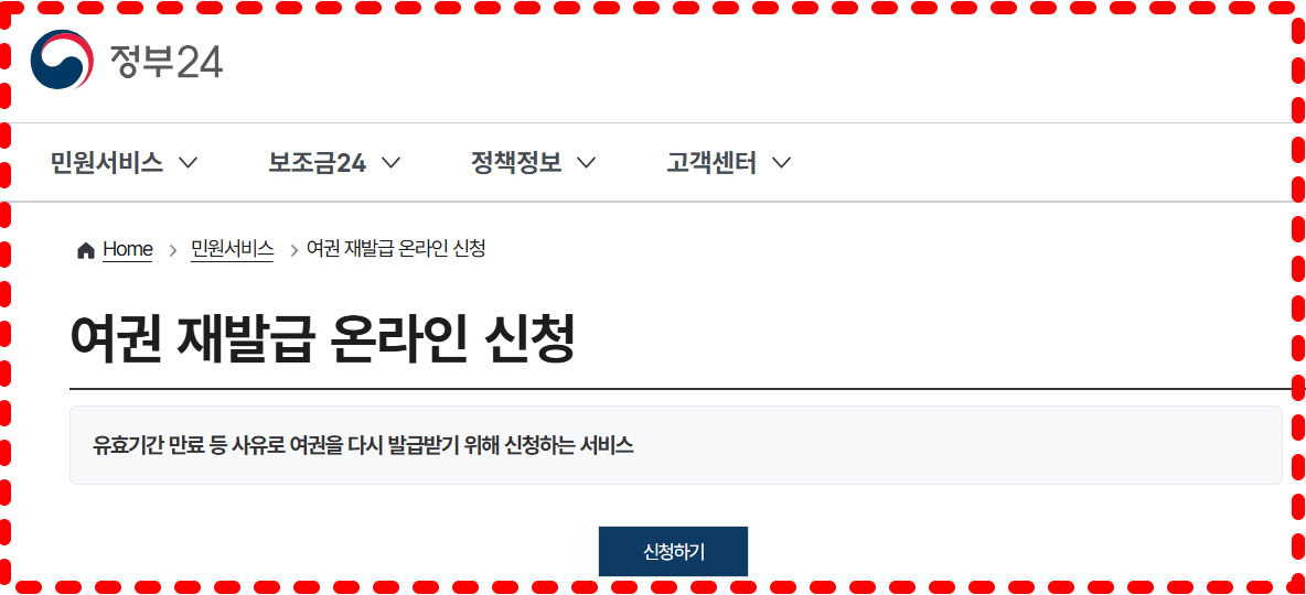 - 로그인 후 '여권민원 → 여권재발급' 메뉴 클릭