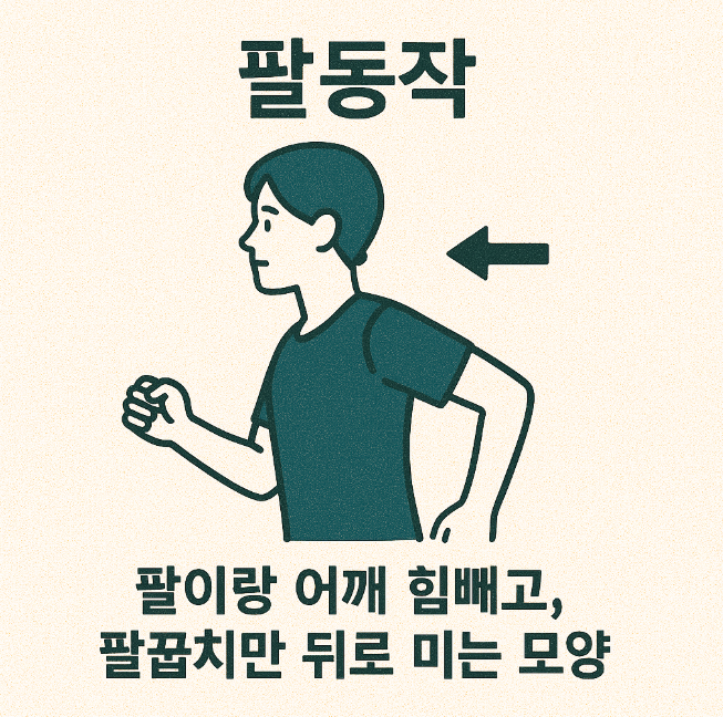 - 팔은 가볍게 흔들며, 이완된 상태 유지.