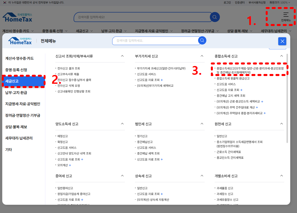 - 전체 메뉴 → 세금신고 → 종합소득세 신고로 이동
