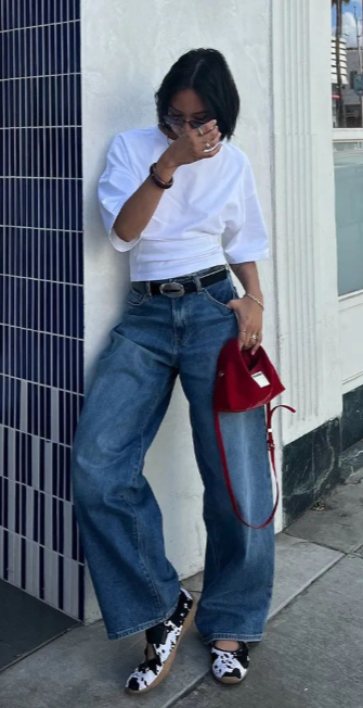 ✔ 뉴트럴 톤 스니커즈 + 와이드진 + 루즈핏 셔츠