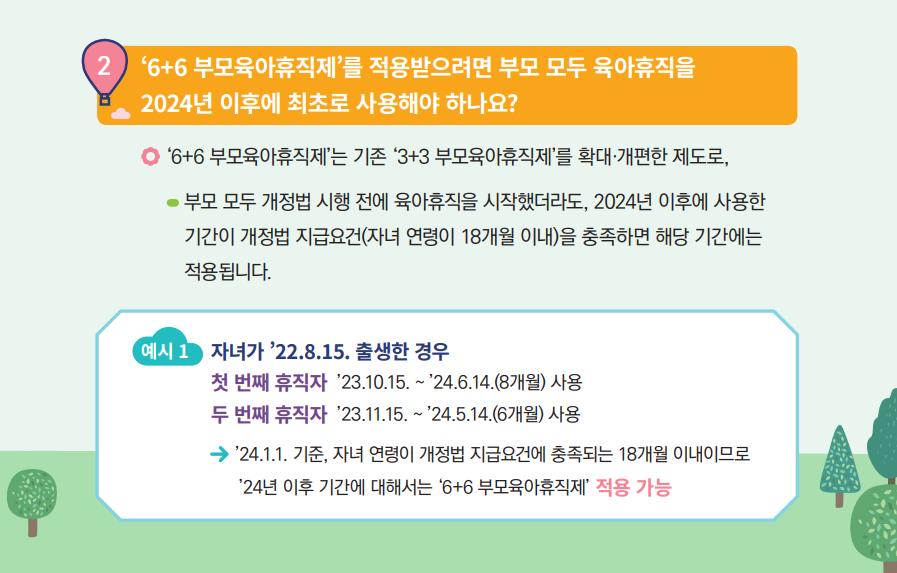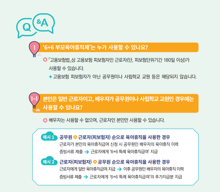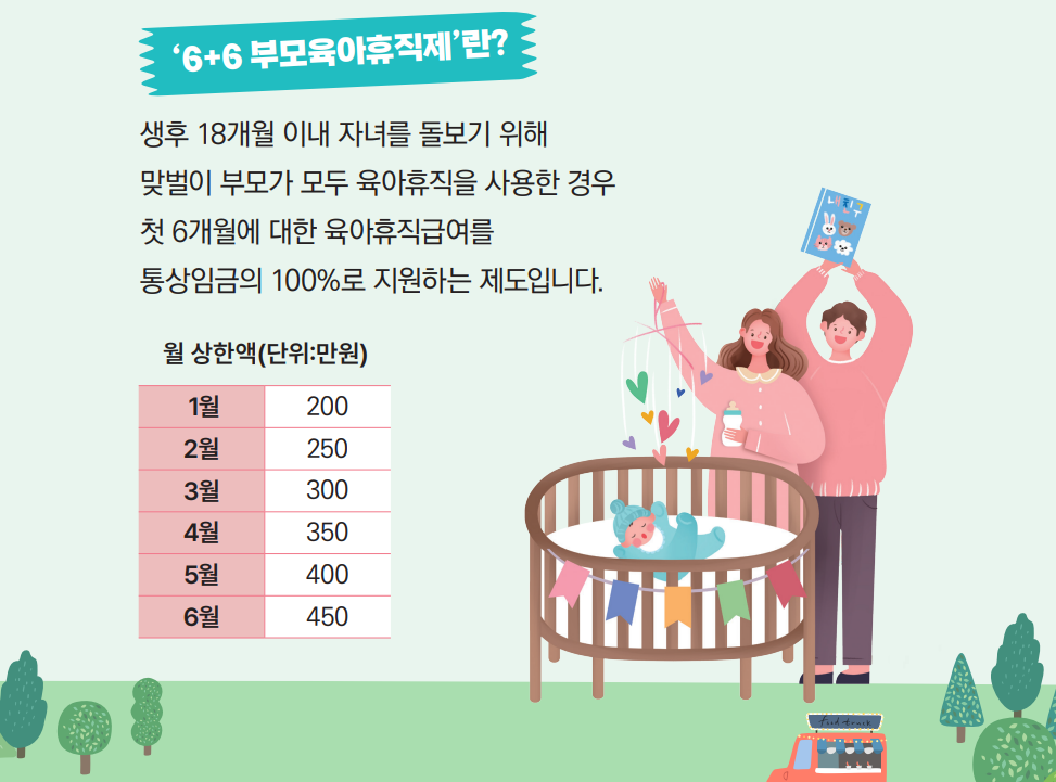 - 첫째 출산 후 남편 → 둘째 후 아내 순으로 사용해 6+6 수당 극대화
