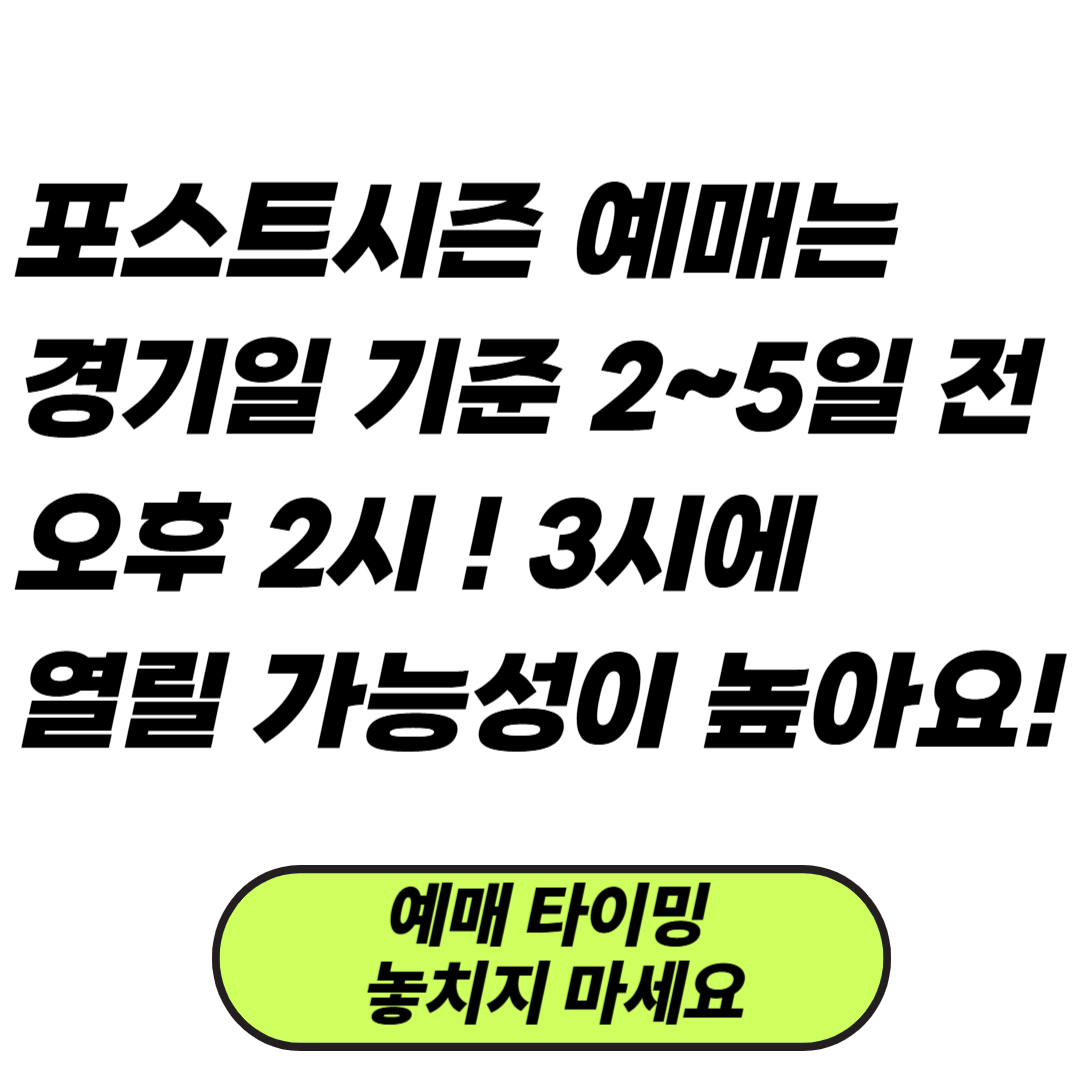 - 포스트시즌 예매는 경기일 기준 2~5일 전 오후 2시 또는 3시에 열릴 가능성이 높습니다 – 예매 타이밍 놓치지 마세요.